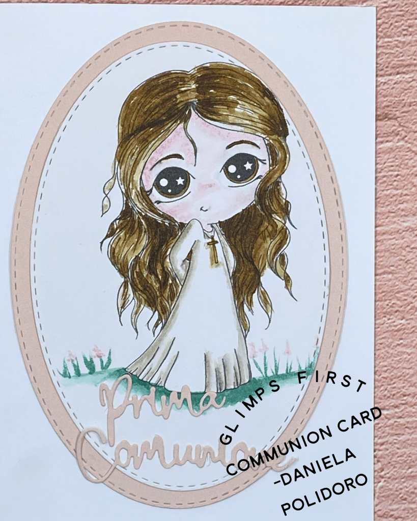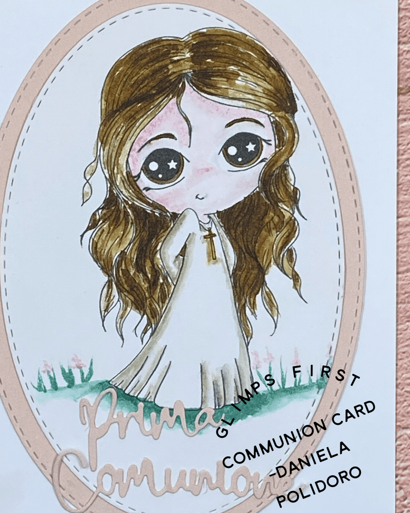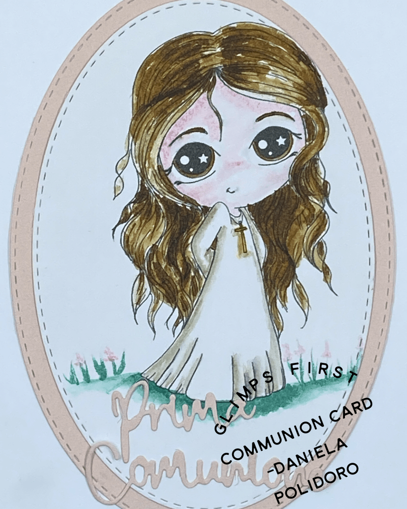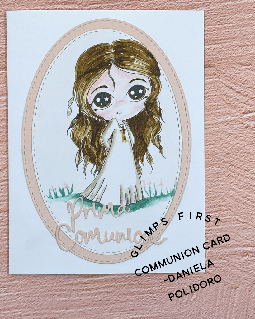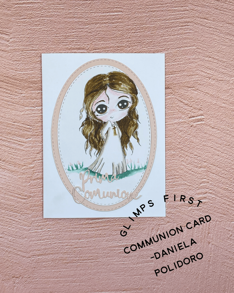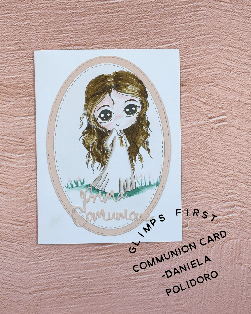 Per la Prima Comunione di una ragazza, ho realizzato questa card grazie a un timbro digitale di Glimps e a una fustella di ModaScrap.
