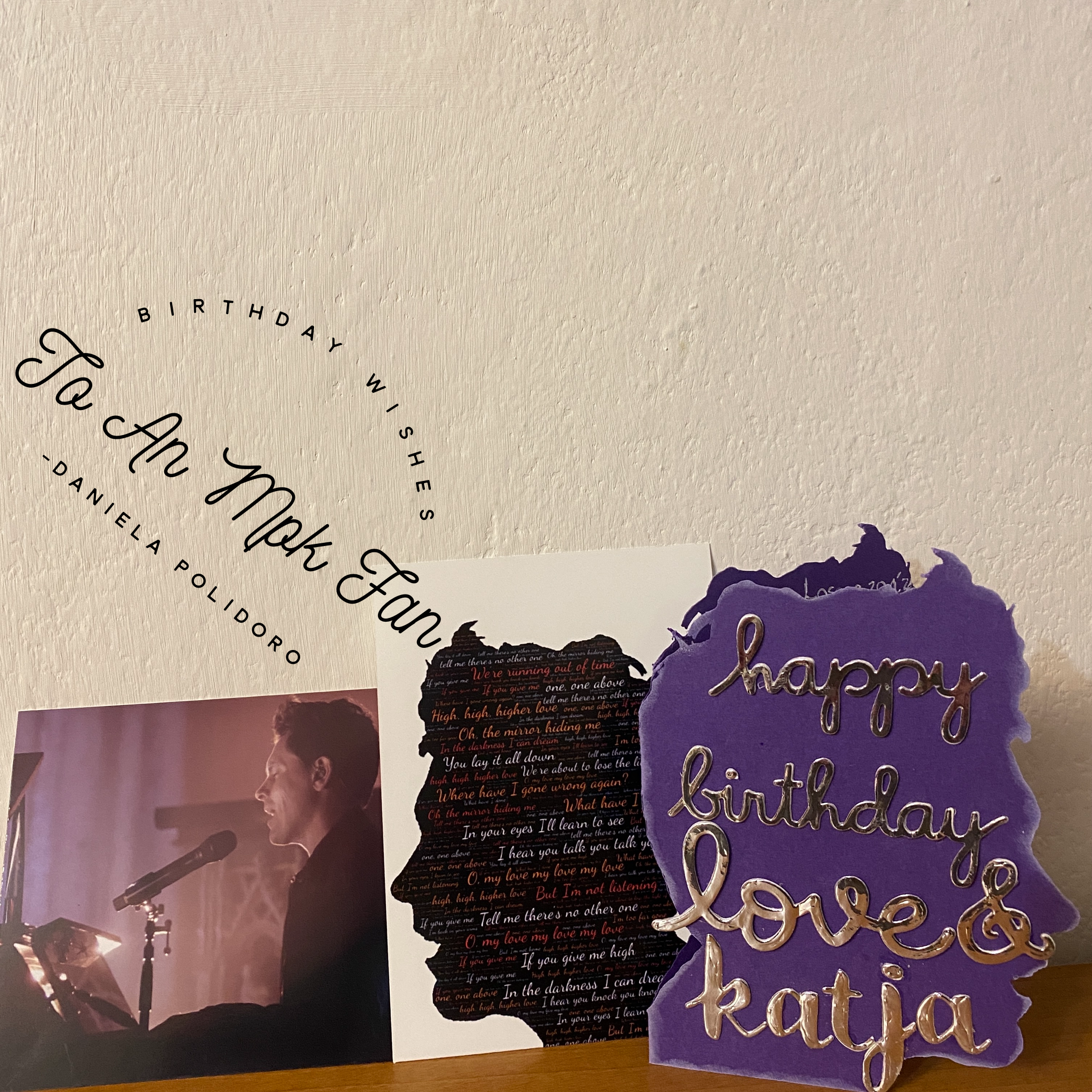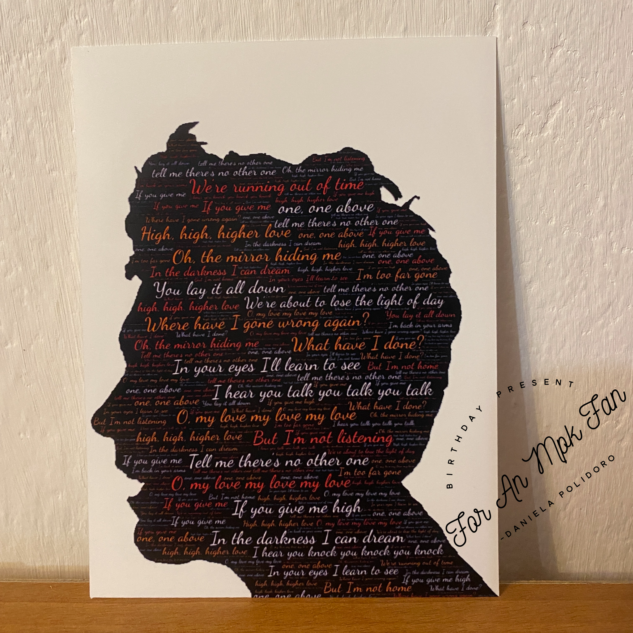 A friend of mine is a fan of Michael Patrick Kelly just like me. Since we both love his lockdown concert held in Cathedral of Cologne, freely accessible on Youtube, and her favorite song is “Higher Love“, I made a print-screen of him during the concert while he was singing that song. From that image I made a black silhouette of his profile. This was my starting point for my two creations: his black silhouette filled with the song’s lyrics and a Michael Patrick Kelly-shaped birthday card diecut with the Silhouette Cameo. For the last one I remembered what I was taught during a course on that electronic die cutting machine by Tommaso Bottalico.